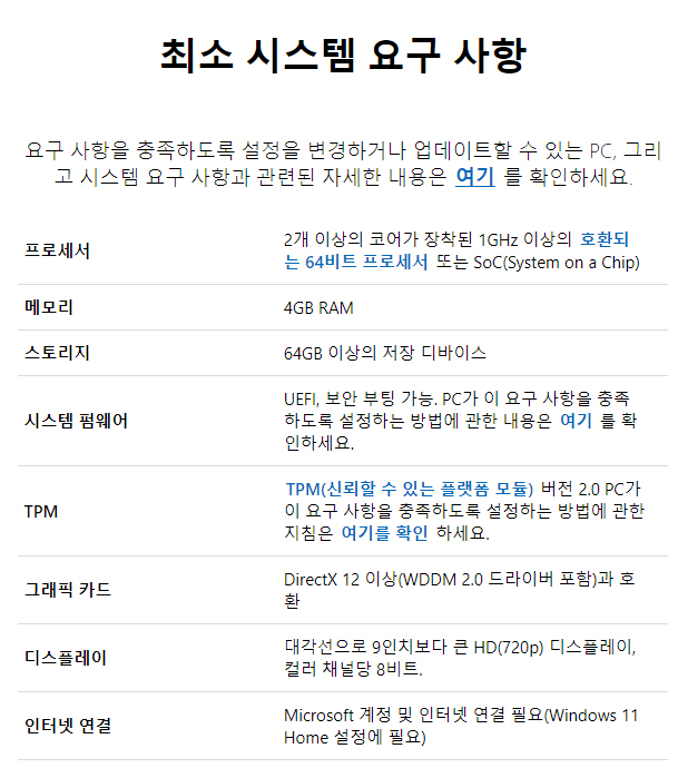 윈도우11의 최소 시스템 요구 사항을 확인해 봅니다.