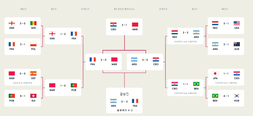 | 2022년 12월 14일 (수) 오전 4시 | 아르헨티나 | 3 | 크로아티아 | 0 | 아르헨티나 진출 |